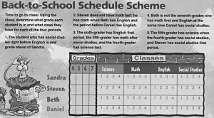 Since the goal of Puzzle-Based Learning is to build a strong generalized (as opposed to domain-specific) foundation, experiencing and practicing a wide variety of puzzles seems a good approach. Look for physical puzzles (like Rubik’s Cube), picture puzzles, word and story puzzles, number and math puzzles, logic puzzles, etc. Everyone has strengths and weaknesses. Don’t just play to a child’s strength; develop areas where she’s weak.